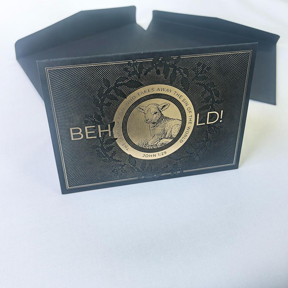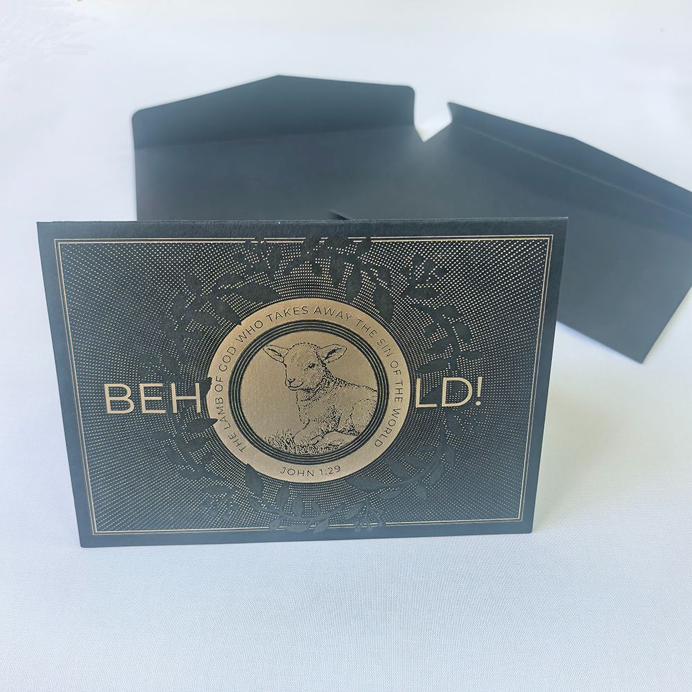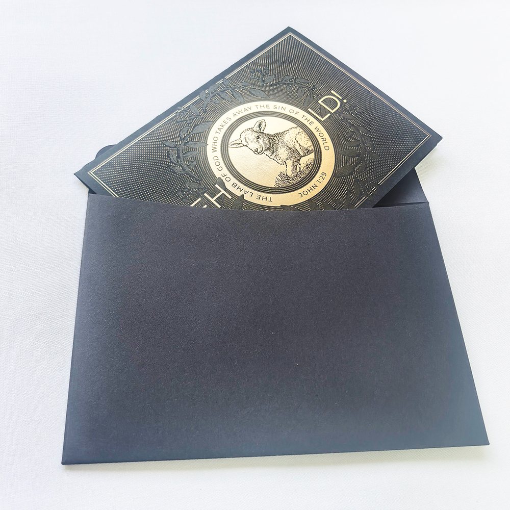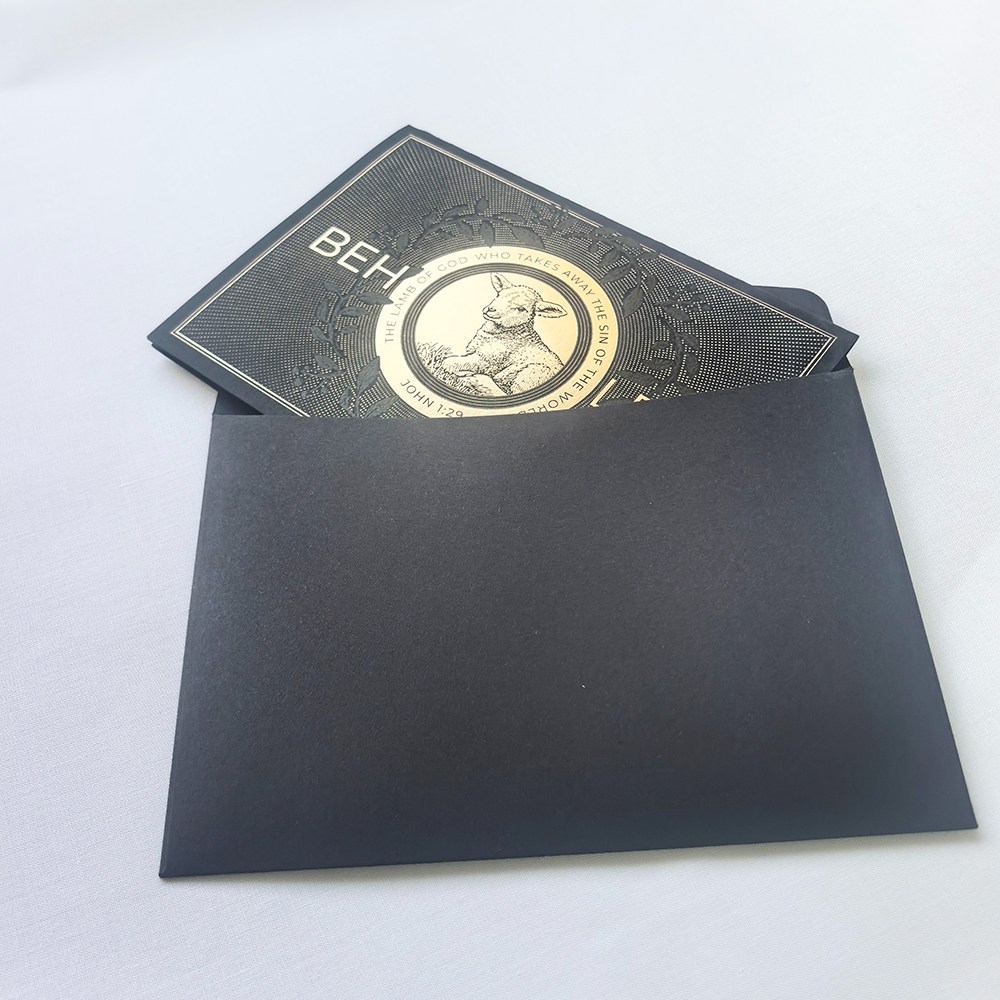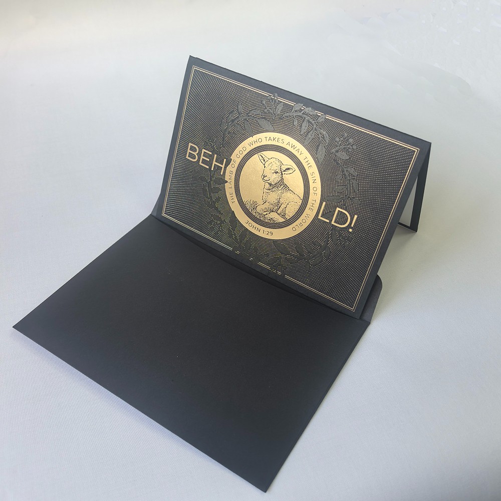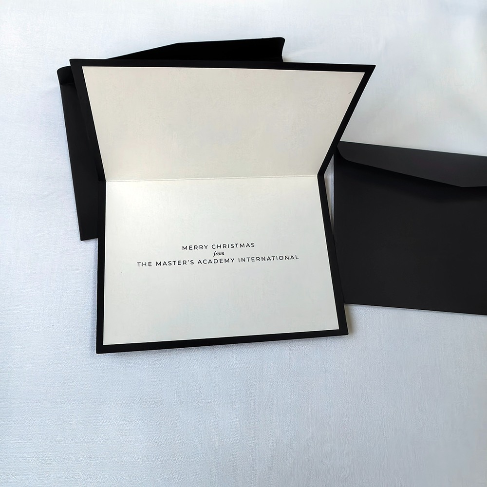 Sunnywell Printing является прямым поставщиком фабрики рождественских открыток. Рождественская открытка черного / зеленого цвета, сложенная пополам, поверхность с тиснением фольгой и тиснением, а также логотипом с УФ-печатью. Карта, которую мы использовали, представляет собой толстый материал, сертифицированный FSC.